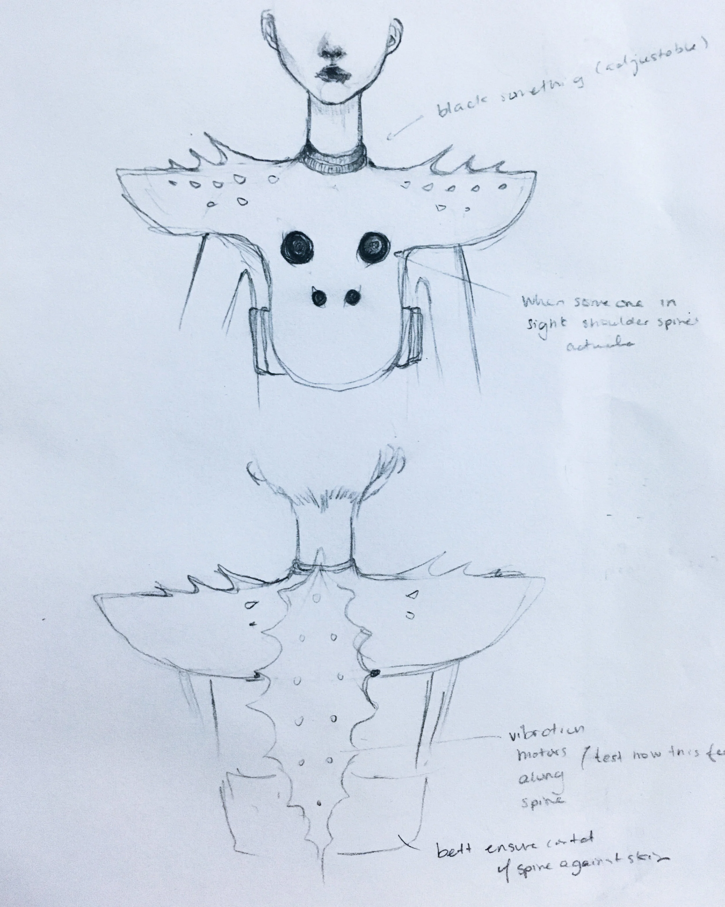 Inspired by the highly personal experience of anxiety in reaction to being approached by unknown people when surrounded by crowds, we created a mechatronic system lives on the body, like a symbiotic parasite. The parasite was a project meant to explore the intersection of technology and intimacy, bodies and data. This wearable system is animated by the breath of the host as the host responds to their environment and in turn the host has an augmented sense of their physiological function. The talons on the shoulders pulse with increasing urgency as a sensor, embedded in the largest eye, detects the proximity of other people; light emitting diodes in the smaller eyes flicker as the host breaths in and out; and the part of the parasite located on the spine of the host vibrates with each breath.